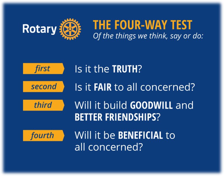- Commitment to Rotary International's Four-Way Test: Above all, we are dedicated to upholding the moral and civic values embodied in Rotary's Four-Way Test: Is it the truth? Is it fair to all concerned? Will it build goodwill and better friendships? Will it be beneficial to all concerned?